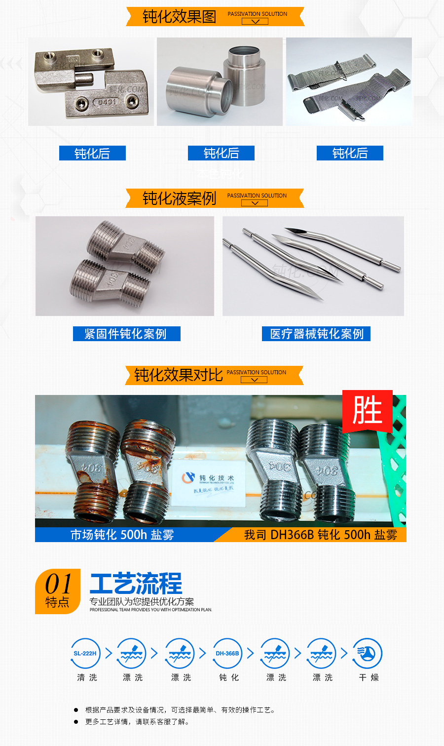 DunHua366B 使用建議 操作方式 浸沒 使用濃度 100% Vol 處理溫度 常溫~50℃ 處理時間 15~60min 適用范圍 奧氏體不銹鋼環保鈍化處理