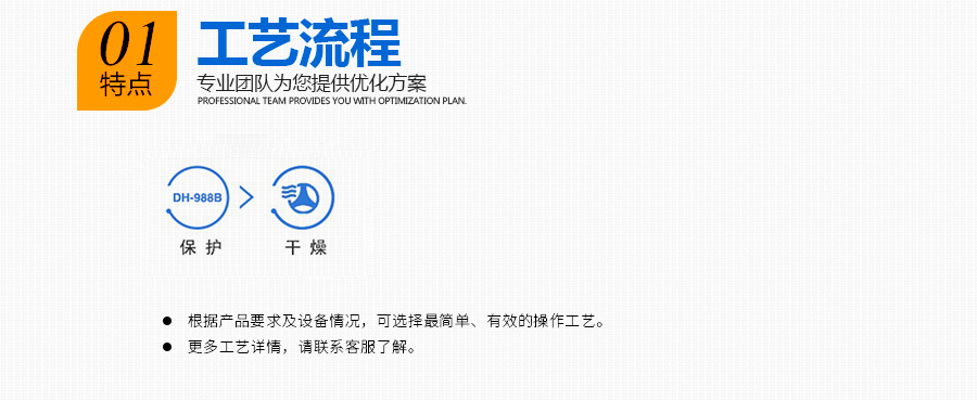 DunHua988B 使用建議 操作方式 浸沒、噴涂、涂抹 使用濃度 100% Vol 處理溫度 常溫 處理時間 10s~3min 適用范圍 銅、鋁、不銹鋼、粉末冶金、鑄鐵、電鍍系列等金屬的封閉抗氧化保護