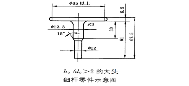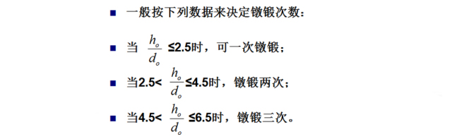 5、考慮工件頭部直徑D與高度H的比值:頭部直徑較大、高度較小的大直徑薄扁頭細桿零件,所需坯料h,/d,在2以上大頭細桿零件,若采用一次鐓鍛成形,就會在頭部邊緣處產生裂紋。類似的工件,只有增加鐓鍛次數,采用逐步成形的方法。