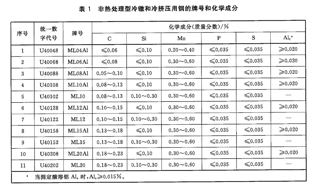 1)非熱處理型冷鐓和冷擠壓用鋼的牌號和化學成分(熔煉分析)應符合表中的規定。