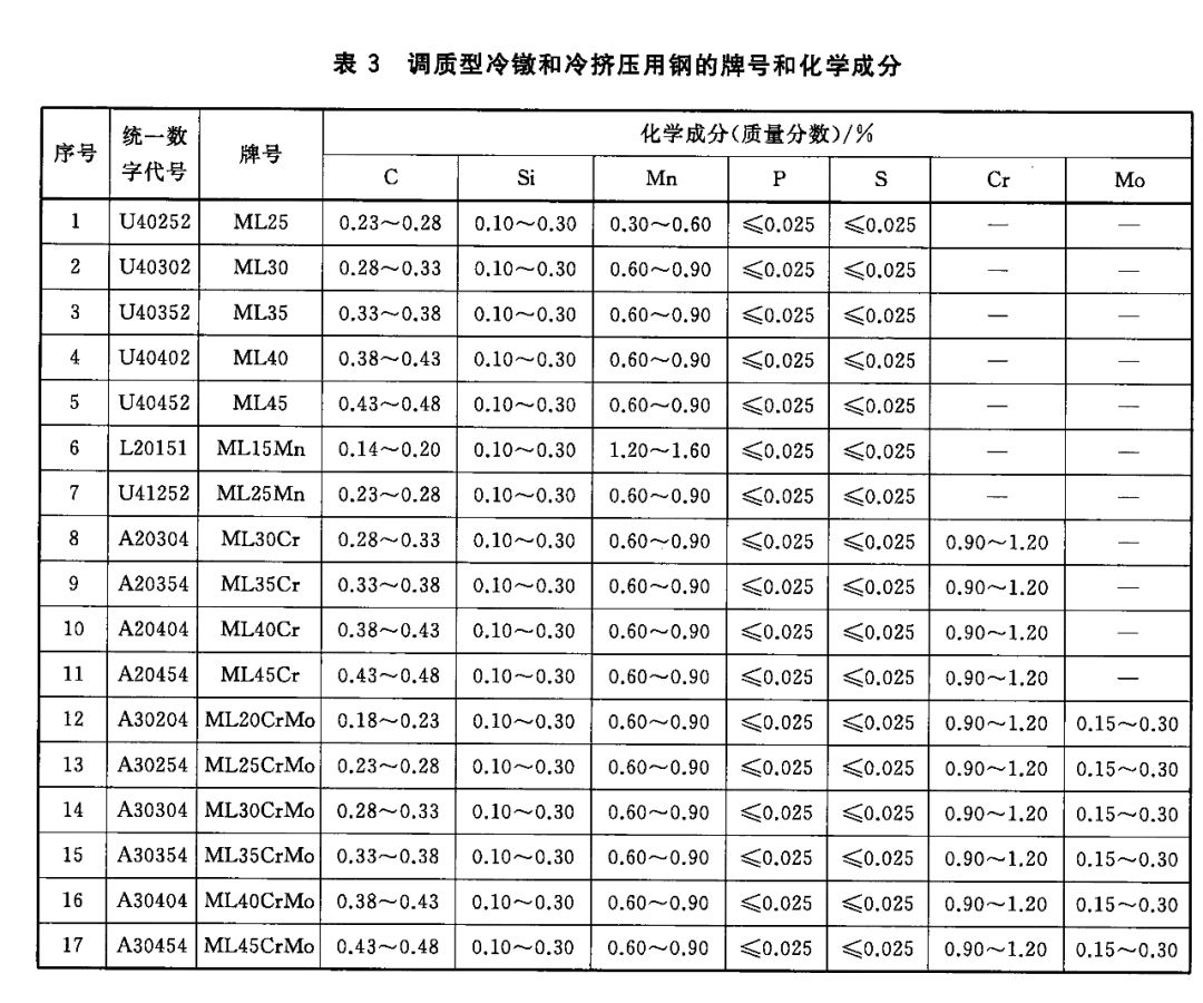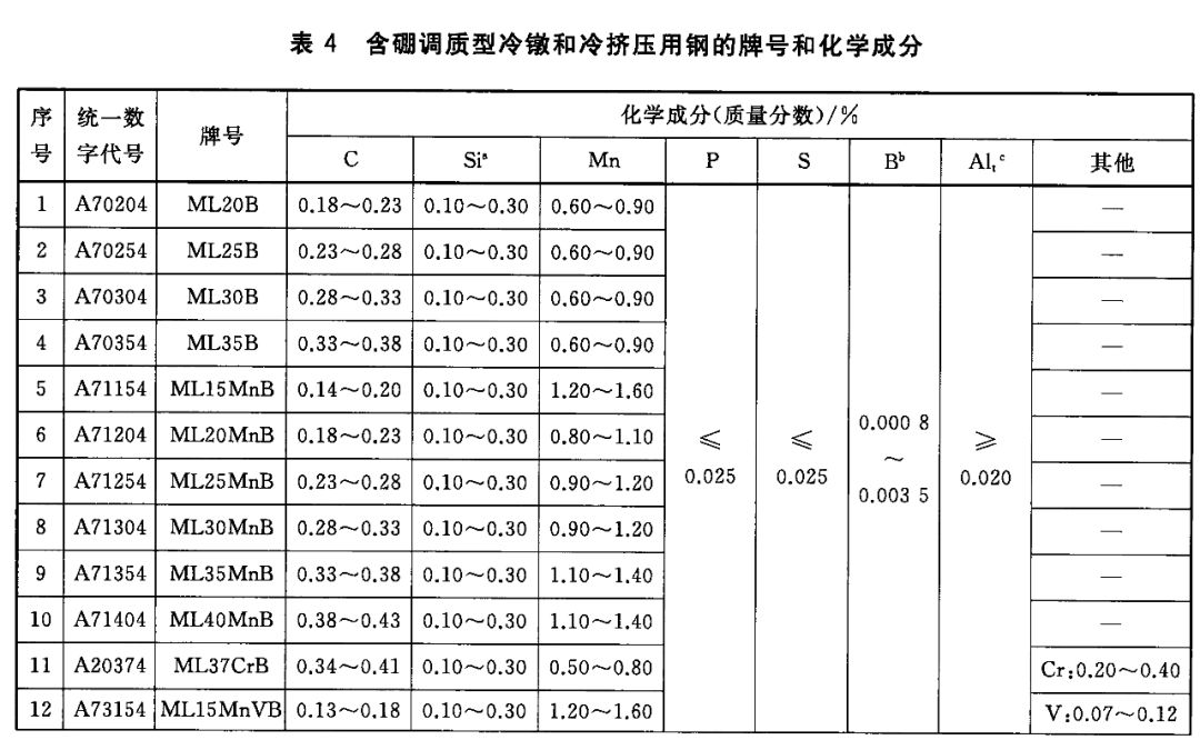 3)調質型冷鐓和冷擠壓用鋼(包括含硼鋼)的牌號和化學成分(熔煉分析)應符合表3和表4的規定。
