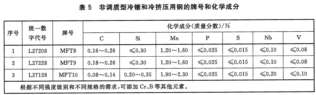4)非調質型冷鐓和冷擠壓運用鋼的牌號和化學成分(熔煉分析)應符合表5的規定。