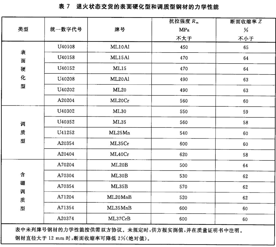 2)非調質型冷鐓和冷擠壓用鋼,熱軋狀態交貨非調質型鋼材的力學性能應符合以下表格規定。