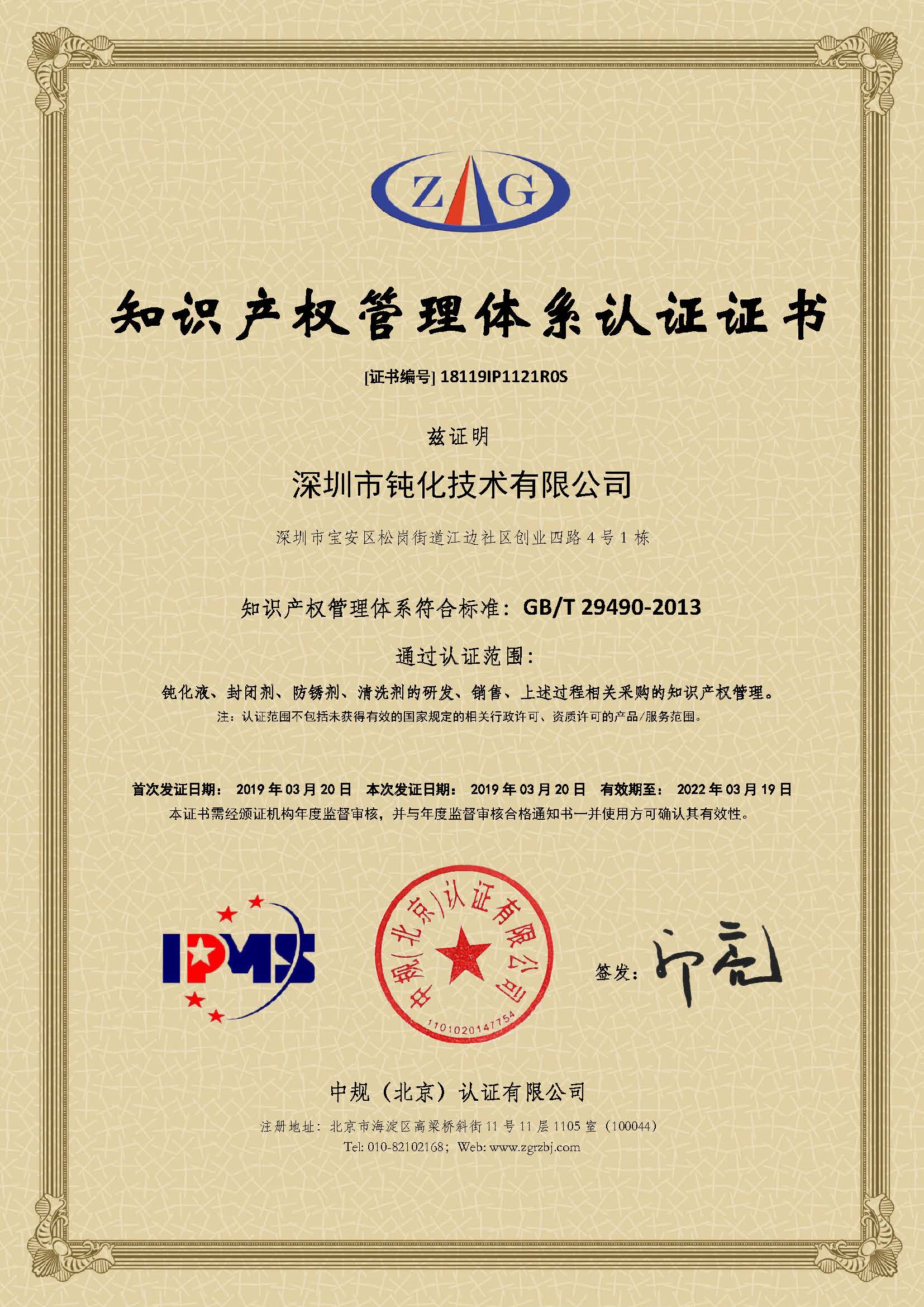 深圳市鈍化技術有限公司近日通過鈍化人的協作與努力,順利通過了知識產權管理體系認證,并收到中規(北京)認證有限公司頒發的《知識產權管理體系認證證書》,認證鈍化技術知識產權管理體系符合標準:GB/T 29490-2013,發證日期2019年03月20日。通過認證范圍為鈍化液、封閉劑、防銹劑、清洗劑的研發、銷售,上述過程相關采購的知識產權管理。