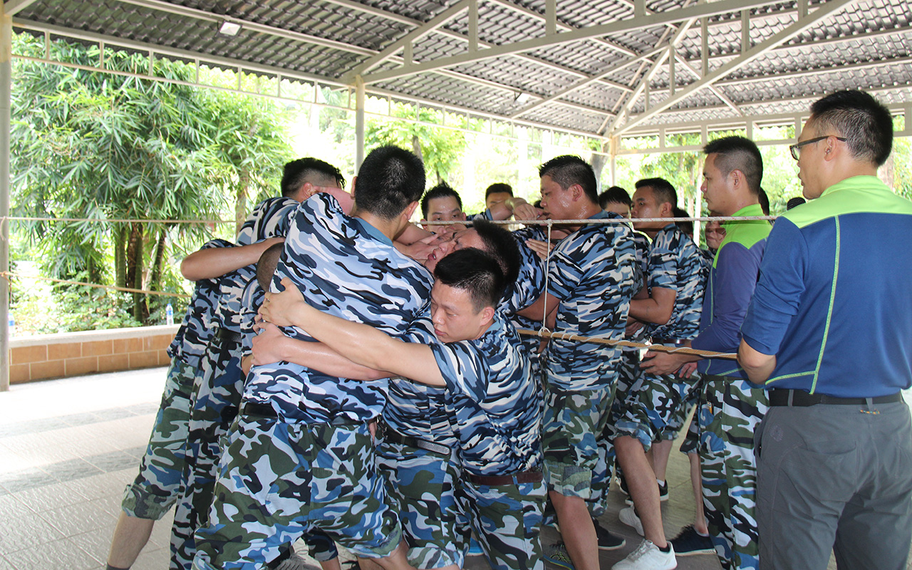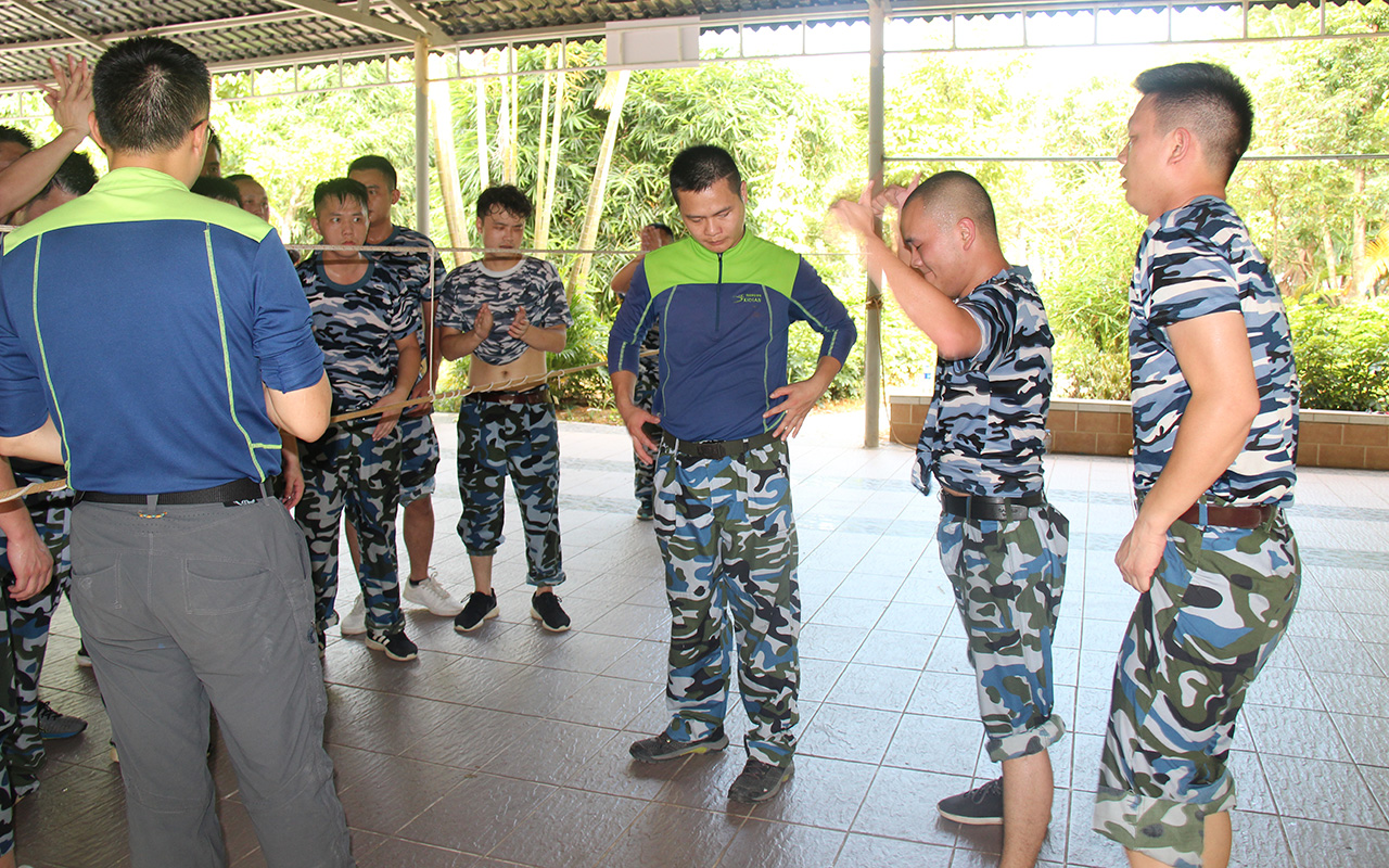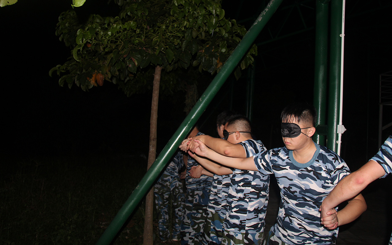 在最后的項目中,三隊合并成一隊按照訓練項目要求,游戲過程中不能發(fā)出任何聲音,在保證絕不碰觸繩索的情況下,所有人必須從一米高,僅容1人通過的洞口通過。這一項目是團隊協(xié)作能力、體力、耐力、智慧與意志的絕對挑戰(zhàn)。